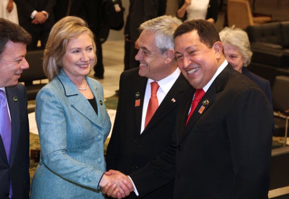 А ето и търсената снимка на Hillary Rodham Clinton и Hugo Chaves Chavez от началото на тази година по време на церемонията по встъпване в длъжност на новия президент на Бразилия (с българско потекло) Дилма Русеф.