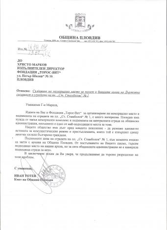 Кметът Иван Тотев, с писмо Изх. № 12ФН158 от 13.07.2012 г. ни уведомява, че „идеята е много интересна”, НО „подземните нива на сградата на пл. „Ст. Стамболов” №1, към момента изцяло са заети с архива на Община Пловдив. Търсим подходящо място за нашия архив, на засега общинската администрация не е намерила подходяща сграда за него” и в заключение сме уверени, че „продължаваме да търсим разрешение на този проблем”.