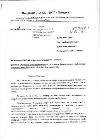 На свое заседание на 16.05. т.г. УС на Фондация „Пловдив-европейска столица на културата” изрази своята принципна подкрепа за идейния проект. На 09.06. фондация „Торос-Вит” организира международна конференция „Комунизмът и ДС – неразказаното минало на България”. Участието надхвърли очакванията ни – дойдоха научни работници дори от САЩ, много репресирани, двама съветници на президента Плевнелиев. Всички подкрепиха идеята с нарочна подписка и декларация. Повече за нея тук – http://toross.blog.bg/politika/2012/06/12/konferenciia-za-antikomunizma-i-dosietata.966896