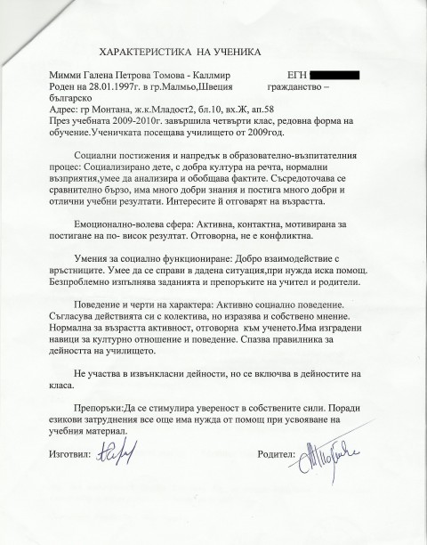 *** Служебна бележка от СОУ „Отец Паисий“ в Монтана, където са учили Мимми, Розита и Румен Томови-Каллмир от 2009-та до края на 2011-та г. В тази бележка пише, че в периода на обучението си в това училище те си били „физически и психически здрави деца, с нормални за възрастта си тегло, ръст и развитие“. Както и, че са били „изключително контактни, жизнерадостни, позитивни и весели“. Документът е подписан от училищния лекар и училищната мед. сестра.
