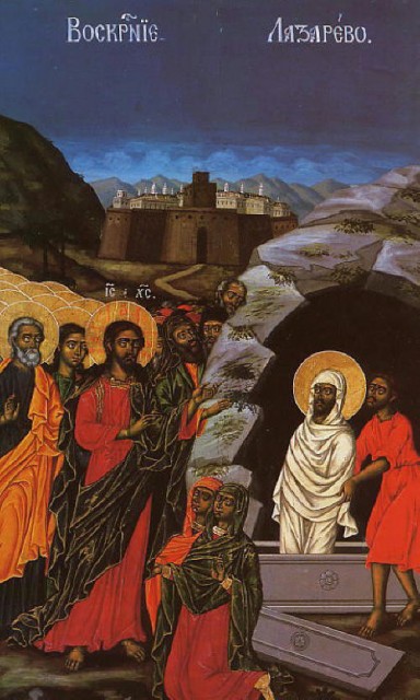 „Марта, като чу, че иде Иисус, посрещна Го; а Мария седеше вкъщи. Тогава Марта рече на Иисуса: Господи, да беше тук, нямаше да умре брат ми. Но и сега зная, че, каквото и да поискаш от Бога, ще Ти даде Бог. Иисус й рече: брат ти ще възкръсне. Марта Му каза: зная, че ще възкръсне при възкресението, в последния ден. Иисус й рече: Аз съм възкресението и животът; който вярва в Мене, и да умре, ще оживее. И всеки, който живее и вярва в Мене, няма да умре вовеки. Вярваш ли това? Тя Му дума: да, Господи, аз вярвам, че Ти си Христос, Син Божий, Който иде на света. Като каза това, отиде та повика скришом сестра си Мария и рече: Учителят е тук и те вика. Тая, щом чу, става бързо и дохожда при Него. (Иисус още не бе дошъл в градеца, а стоеше на мястото, дето Го бе посрещнала Марта.) Иудеите, които бяха с нея вкъщи и я утешаваха, като видяха, че Мария стана бързо и излезе, отидоха подире й, мислейки, че отива на гроба – да плаче там. А Мария, като стигна там, дето беше Иисус, и Го видя, падна при нозете Му и рече: Господи, да беше тук, нямаше да умре брат ми. Иисус, като я видя да плаче, и дошлите с нея иудеи да плачат, разтъжи се духом, смути се и рече: де сте го положили? Казват Му: Господи, дойди и виж. Иисус се просълзи. Тогава иудеите казваха: гледай, колко го е обичал. Някои пък от тях казаха: не можеше ли Тоя, Който отвори очите на слепия, да направи, щото и тоя да не умре? А Иисус, пак тъгувайки в Себе Си, дохожда при гроба; това беше пещера, и камък стоеше отгоре й. Иисус казва: дигнете камъка. Сестрата на умрелия, Марта, Му казва: Господи, мирише вече; защото е от четири дена. Иисус й дума: не казах ли ти, че, ако повярваш, ще видиш славата Божия?“