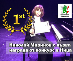 Както информира вестник „Марица“, 12-годишният Николай Маринов от Пловдив е спечелил наскоро Първа награда на Седмото издание на Международен конкурс за пианисти „Simone Delbert – Fevrier”, организиран от Националната консерватория в Ница. Възпитаникът на Светлана Косева от Националното музикално училище „Добрин Петков” в Пловдив е участвал в категорията „Млади таланти“, в група, с две степени по-висока от определената за неговата възраст. С разрешение на директора на консерваторията в Ница, обещаващият млад музикант е бил поканен да свири на заключителния концерт на конкурса.