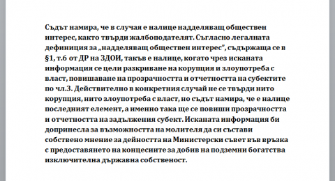Сговорна дружина планина повдига – четвърта победа – решение на съда в полза на жалба за отказ от достъп до информация за т.нар. златни концесии. Съдът реши, че държавната администрация няма право да крие концесионните договори с частните фирми „Дънди Прешъс Металс“, „Асарел-Медет“, „Елаците-Мед“ и „Горубсо-Кърджали“, защото общественият интерес е надделяващ над частния. Името на съдийката, издала това решение, е Луиза Христова.
