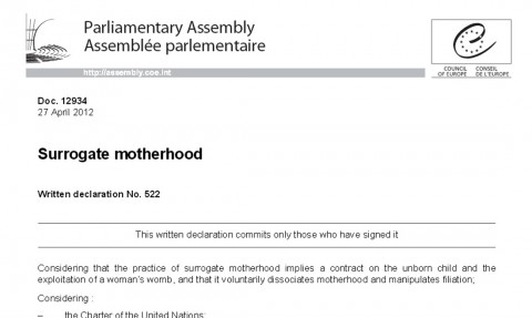 Две години по-рано 22 депутати от Европейската народна партия (ЕНП) и членове на Парламентарната асамблея на Съвета на Европа (ПАСЕ) подписаха декларация, в която потвърждават, че сурогатното майчинство е несъвместимо с достойнството на жените и засегнатите деца, и е нарушаване на техните фундаментални права.