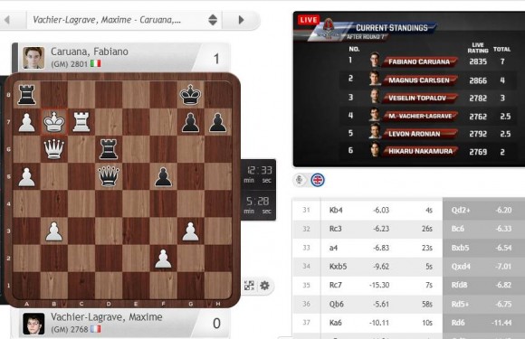 Изненадата е, че световният шампион не е основният фаворит на турнира. Италианецът Фабиано Каруана спечели вече 7 (седем) партии подред без да допусне дори едно равенство! Това е историческо постижение. Досега такава поредица от победи на такова високо ниво са могли да постигнат само няколко изключителни шахматисти. В осмия кръг ще се срещне с Карлсен и дори равен резултат ще му осигури първото място и чек за 100,000.00 долара. Топалов ще играе с черните фигури срещу американеца Накамура. Турнирът ще продължи до 7 септември.