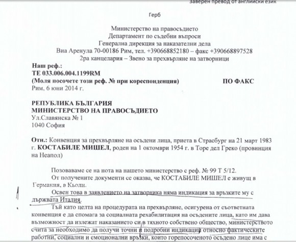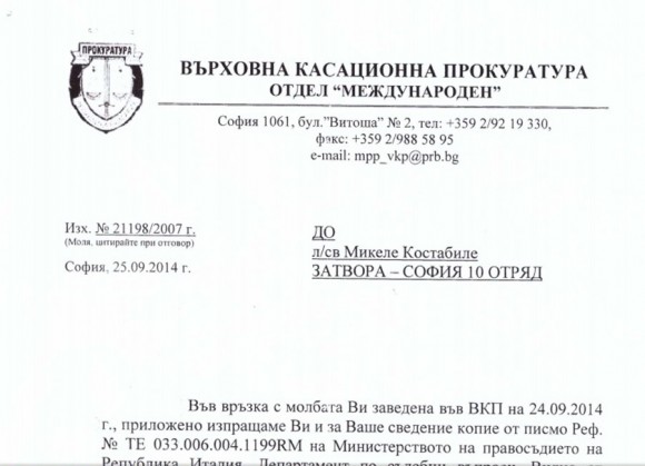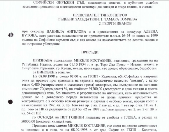 Пак се зачетох в Присъда № 34 от 16.10.2002 г. на Софийски окръжен съд: Софийски окръжен съд: „Признава подсъдимия Микеле Костабиле, италианец, гражданин на Република Италия, роден на 01.10.1954 г. в гр. Торе дел Греко – Италия, за виновен…”. Към това добавям непонятното мнение на италианските правосъдници: „Лицето няма трайно установени отношения с италианската държава”!?!