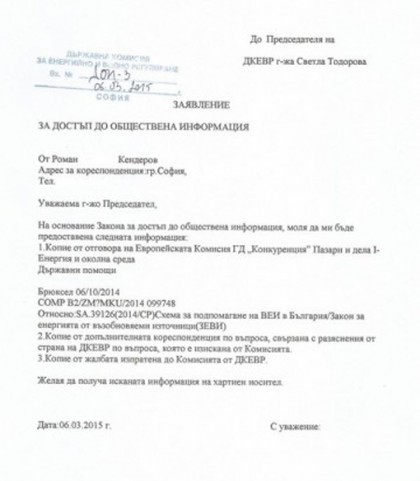 Гражданският активист Роман Кендеров изпраща на 6 март 2015 г. Заявление за достъп до информация до Държавната комисия за водно и енергийно регулиране /ДКЕВР/ с искане да получи информация относно схемата за подпомагане на ВЕИ в България и копие от Отговора на Европейската комисия относно държавните помощи в тази сфера.