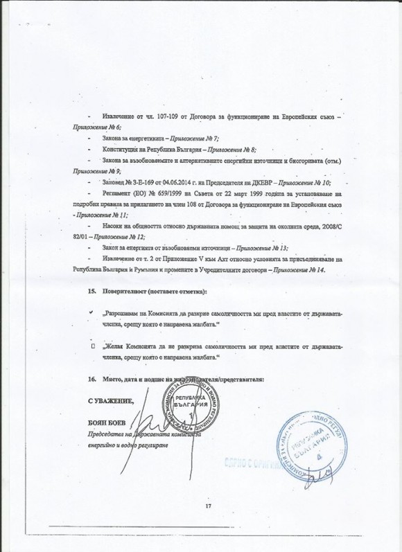 Жалба до Комисията на ЕС от Боян Боев, председател на ДКЕВР, относно неспазване правото на ЕС, подадена на 20.06.2014 г. /1 стр./Жалба до Комисията на ЕС от Боян Боев, относно неспазване правото на ЕС /2 стр./Жалба до Комисията на ЕС от Боян Боев, относно неспазване правото на ЕС /3 стр./Жалба до Комисията на ЕС, относно неспазване правото на ЕС /4 стр./Жалба до Комисията на ЕС, относно неспазване правото на ЕС /5 стр./Жалба до Комисията на ЕС, относно неспазването правото на ЕС /6 стр./Жалба до Комисията на ЕС, относно неспазването правото на ЕС /7 стр./Жалба до Комисията на ЕС, относно неспазването правото на ЕС /8 стр./Жалба до Комисията на ЕС, относно неспазването правото на ЕС /9 стр./