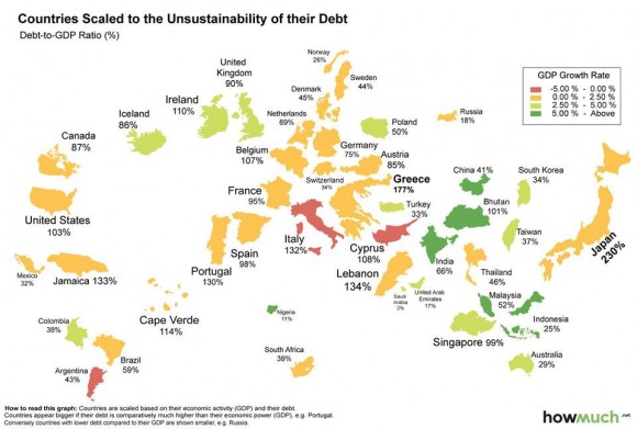 На инфографиката, илюстрираща коментара, всяка страна е представена в мащаб въз основа на своя дълг към БВП. Страните, които са по-малки по размер, но които имат голям дългов товар, се открояват повече. Световната карта на дълга е коментирана по следния начин: