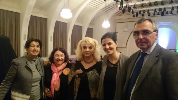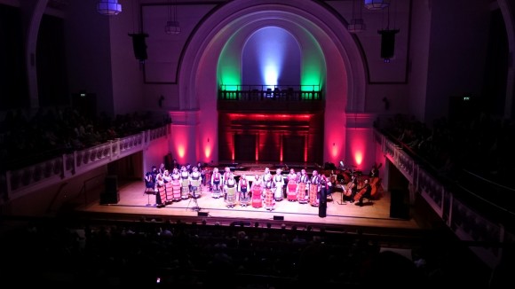 В началото, на затъмнената сцена, заедно с навлизащото осветление на прожекторите, най-напред прозвучаха мъжките гласове на изпълнителите от прочутия ни Лондонски български хор на Десислава Стефанова: „Девойко мари, хубава”… Родопа планина лъхна с мириса на бориките в залата. И когато жените подеха”Мое со бално по-множко, юначе…”, в очите на мнозина имаше и сълзи. Г-жа Десислава Стефанова е ръководител на такъв хор за народно пеене и в Швейцария, а освен това е и преподавател в нашето училище по народно пеене. Невероятна е, невероятен е и нейният хор, който всяка година по няколко пъти препълва с почитатели известни зали в Лондон (и не само). Затова тя бе номинирана тази година за отличието на ДАБЧ – „Българка на годината – 2015”.