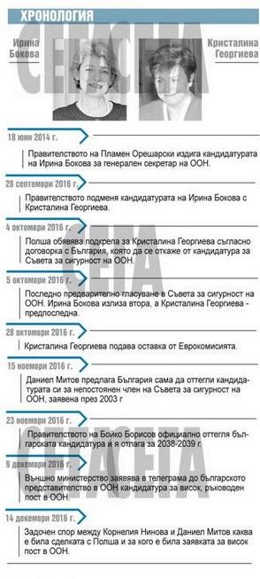 Лют задочен спор между лидерката на БСП Корнелия Нинова и външния министър Даниел Митов изкара наяве вчера нови аспекти на злепоставянето на България в ООН. За да прокара злополучната кандидатура на Кристалина Георгиева за генерален секретар на ООН, държавата се е отказала от собствената си кандидатура, заявена още на 18 декември 2003 г., за непостоянен член на Съвета за сигурност на ООН (СС на ООН) през 2018-2019 г. Сделката е била с Полша, която срещу подкрепа за Кристалина Георгиева е получила обещание от България да остане единствен кандидат от Източна Европа за мястото в СС на ООН.