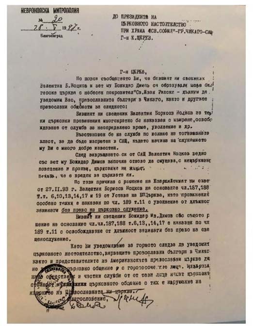 2/ Като свещеник тук е бил представен с лъжа, че е с изрядни документи /good sranding/, лицето Валентин Борисов Ноцков, който е дошъл за втори път в Америка без отпустително писмо и по-късно низвергнат за неподчинение. Според каноните, той е лъжесвещеник и всички тайнства, извършени от него, са невалидни и престъпни, като никога не са издавани документи за тях.