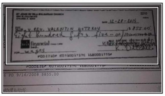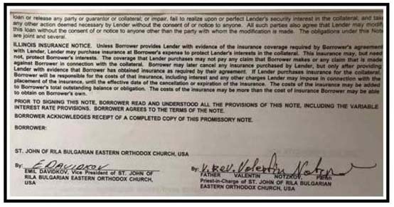4/ Лицето Валентин Борисов Ноцков, година след смъртта на митрополит Кирил Йончев /2007/, при напълно изплатена църква от енориашите на Чикаго, дръзва да вземе самоволно огромен кредит от 350 000$, като залага сградата на храма, която не му принадлежи и той е никакъв на църквата, за да измами банката и са вземе този неправомерен заем.