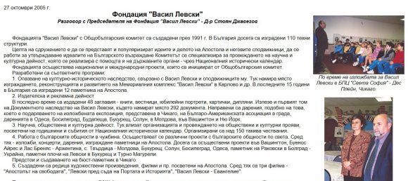 Историята е проста, потърсиха ме от Националния музей в Карлово през 2005 г. за съдействие да настаним трима души, които ще пътуват с президента и неговата делегация за Чикаго. Те ще носят около 30 пана с най-известните фотоси на Левски и негови съратници, притежание на музея. Имаха желанието да ги покажат и дарят на българската общност. Досега тези пана са тук, в Чикаго, и всеки път са част от тържествения фон по време на Олимпиадата за Левски.