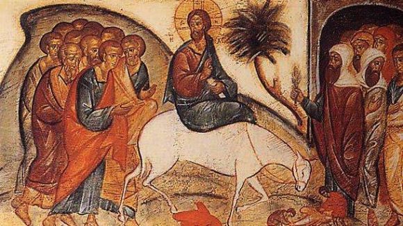 Според евангелистите Христос пристига в града, яздейки магаре, а вярващите го посрещат, като разстилат пред него дрехите си и маслинови клонки. След като възкресил престоялия четири дни в гроба Лазар, брат на сестрите Марта и Мария, Иисус Христос тръгнал за Йерусалим.