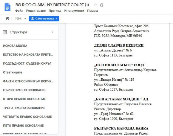 „Делото срещу Делян Пеевски по американския закон RICO (Racketeer Influenced and Corrupt Organizations Act) в Окръжния съд на щата Ню Йорк, район Южен, вече на практика тече. Това показа проверка на Actualno.com в специалната онлайн система за съдебни справки на САЩ (Pacer Monitor). Според справката, още на 16 април пред съда са се представили както адвокатът на Пеевски по делото, така и юридическият защитник на БНБ. Припомняме, че освен Пеевски, страна по делото е и БНБ, също така и „Булгартабак“, както и бившите квестори на БНБ Елена Костадинчев и Станислав Лютов (пълна справка с ответниците можете да видите ТУК). По делото, отново като ответник, е призована и руската банка VTB.