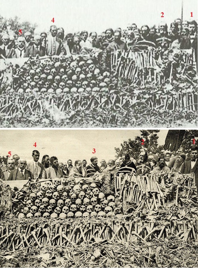 Както и очаквах, тарабите са абсолютно еднакви, и то до най-дребните детайли. С изключение на костите най-ниско долу пред тарабите. Показал съм и пет репера на еднакви хора от двете снимки. Репер 2 показва Православен свещеник с кръст.