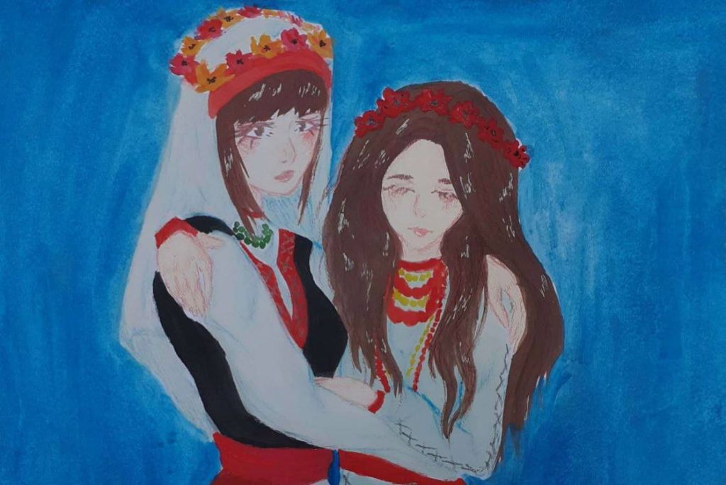Когато попитах в началото на следващия урок за рисунките, едва по-малко от половината се бяха постарали да изпълнят поставената задача. Естествено, докато те ни представяха рисунките си, останалите използваха времето да порисуват с химикалки в тетрадките си, но така получих възможност да се насладя на първата прекрасна рисунка – тази на Полина! Девойчето в моите възприятия е много мило, скромно, тихо и нежно. Изпълнява прилежно задачите, както и този път, без да парадира с участието си. Помолих я да ми разкаже какво е изобразила на картината си, а тя ми представи своята идея: две млади жени, девойки, които символизират двете страни – България и Украйна. Както се вижда, българката е прегърнала, в опит да подкрепи, своята посестрима, която е притворила очи, тъжна и отмаляла… Все едно здравата девойка е дала опора на ранената, която се е опряла на нея, немощна и обезсилена. Но най-интересното и най-красивото са облеклата им – те са облечени в национални носии. И безпогрешно можем да различим българската носия от украинската – по черното елече (или горна част от сукман). Общото, сродното между тях са белите ризи, символ на чистотата и невинността, и сходните престилки с бродирани цветя.