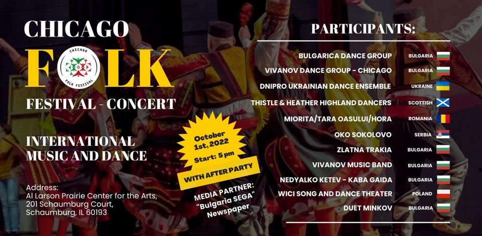 We cordially invite you to join us to this year’s Chicago Folk Festival – Concert on October 1st, 2022. The event will take place at Al Larson Prairie Center for the Arts, 201 Schaumburg Court, Schaumburg, IL 60193, starting at 5pm.