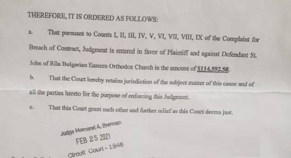 Казусът с този храм стигна до юридическо разрешение, когато на 20 юли 2012 г., след няколко отлагания и 7 години съдебни спорове, бе оповестено съдебното решение по делото за БПЦ “Свети Иван Рилски Чудотворец” в Чикаго. Според решението, „Св. Иван Рилски “ е легитимна българска източноправославна църква в САЩ, намираща се под йерархическото пълномощие на Архиепископа на Диоцеза на Толедо към Православната църква в Америка.