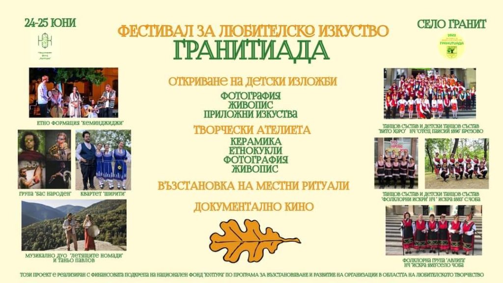 На 24 и 25 юни в село Гранит, община Братя Даскалови, се проведе първият по рода си фестивал за любителски изкуства ГРАНИТИАДА. Богатата и разнообразна програма на фестивала развива и обогатява културния живот в региона. От октомври 2022 г. до май 2023 г. в няколко населени места – Гранит, Брезово, Чирпан се проведоха обучения по живопис, фотография и приложни изкуства с деца. В продължение на 9 месеца бяха открити и обучени много талантливи деца – ИЗЛОЖБА на над 200 творби бе изложена по време на фестивалната програма.