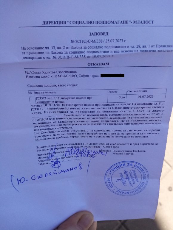 Поисканата с подадено заявление помощ за покриване на здравни осигуровки е отказана със заповед на Дирекция „Социално подпомагане“ – Младост, издадена на 25 юли т.г. и подписана от началника на дирекцията, г-н Емил Трифонов. В тази заповед се казва, че лицето не живее на посочения в заявлението адрес, че е невъзможно провеждане на социална анкета в дома на лицето, че нямало инцидентно възникнала жизнена потребност, че лицето иска заплащане на осигуровки за минал период и пр. Това, че лицето няма дом и неговите адресни регистрации – и тази за постоянен адрес, и тази за настоящ адрес – са фиктивни, е добре известно на социалните служители в Панчарево, които са го посетили и са говорили с него в къщата, където е бил временно подслонен. Което въобще не е попречило в тази заповед да фигурират подобни мотиви за отказ.