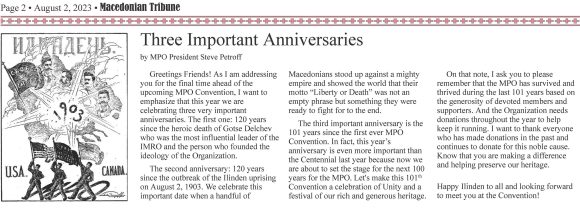 – Бе даден мандат на МПО „Пирин“ – Чикаго и на неговия председател Красимир Костов за проучване на възможностите за дигитализация на архива на МПО от Музея на организацията, който се намира във Форт Уейн, Индиана. Там е и архивът на в. „Македонска трибуна“. Дигилитазията трябва да стане на високо технологично ниво. Проучването се отнася и за финансовата рамка за извършване на дигитализацията.