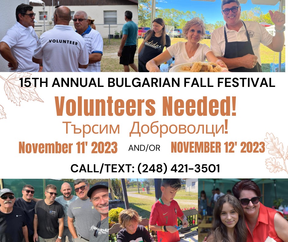 Българската православна църква „Св. Георги“ във Флорида (St. George Bulgarian Orthodox Church of Central Florida, 1185 Bunnell Rd., Altamonte Springs, FL, United States, Florida) търси доброволци във връзка с провеждането на Петнадесети годишен есенен фестивал (15th Annual Bulgarian Fall Festival).