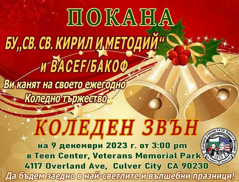 Българско училище „Св. св. Кирил и Методий“ – Лос Анджелис и BACEF/БАКОФ организират на 9 декември 2023 г., събота, от 3:00 pm, годишното си коледно тържество.