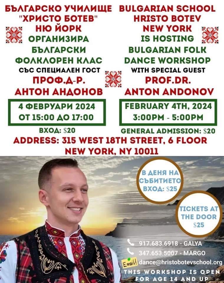 На 4 февруари т.г., от 15 до 17 часа, Българско училище „Христо Ботев“ в Ню Йорк (Bulgarian School – New York) организира български фолклорен клас със специален гост – проф. д-р Антон Андонов. (Повече информация – в приложения афиш за събитието.)
