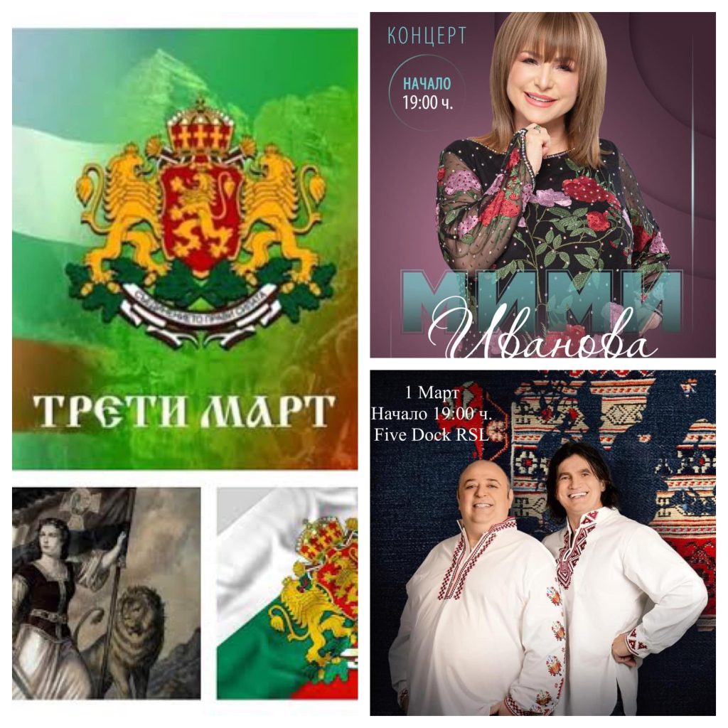 На 27 февруари в Club Five Dock RSL (66 Great N Rd, Five Dock NSW 2046, Australia) ще има концерт на познатата и обичана българска певица Мими Иванова, която ще изпълни свои хитове, както и нови свои песни. А на 1 март, в същия клуб, познатите и обичани актьори Любо Нейков и Влади Априлов ще представят комедийния спектакъл „Стани, Юнак Балкански!“.