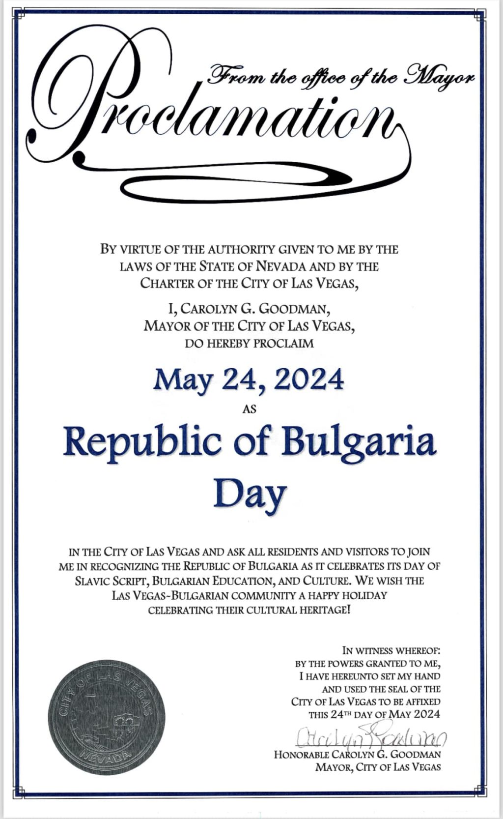 24-ти май бе обявен за ден на България в Лас Вегас! Това се случи за втора поредна година, по инициатива на генералния консул на България в Лос Анджелис, г-н Бойко Христов, с която се цели официалното признаване на приноса на българската диаспора за изграждането на културния облик на града.