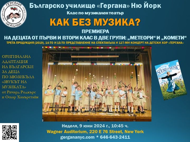 Герганчета от 1-ви и 2-ри клас, в два състава – „Комети“ и „Метеори“, ще изиграят две представления на „Как без музика“ (детска версия на The Sound of Music), за 14 и 15 път, на 9 юни, в аудиториума на училището ни, от 10:45 часа. Заповядайте да се насладите на нашите весели, усмихнати, работиви (и поради това талантливи) и слънчеви деца!