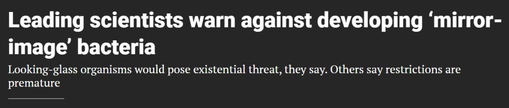 Докато на 12 декември 2024 г. 38 учени, сред които и нобелисти, публикуваха в реномираното научно списание Science („Наука“) призив за спиране на изследванията и финансирането на проекти за създаване на огледални форми на живот, по-конкретно – на синтетични огледални бактерии, протеини и други биомолекули (mirror-image molecules). Призивът предупреждава, че това е „безпрецедентен риск“ за живота на Земята. Учените обесняват, че огледалните бактерии могат да се установят в околната среда и да преминат през имунната защита на естествените организми, излагайки хората, животните и растенията на смъртоносен риск от инфекции. Въпреки че създаването на жизнеспособни огледални бактерии вероятно ще отнеме поне десетилетие, но учените отсега призоват да се спре тази „огледална приказка“.