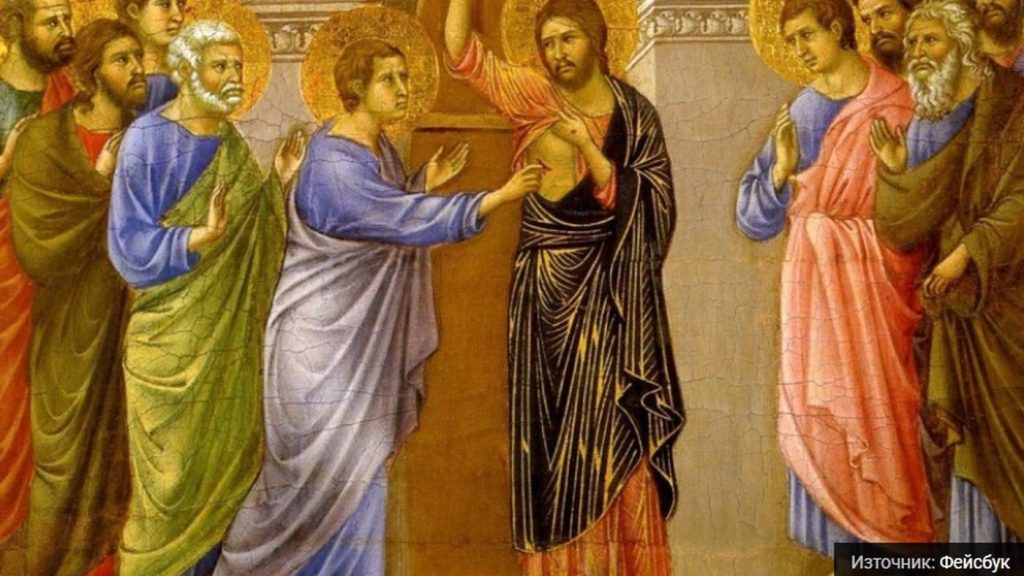 Апостолите му казали: „Видяхме Господа“, но той не искал да им повярва, докато сам не Го види с очите си и докато не попипа Неговите рани („Ако не видя на ръцете Му раните от гвоздеите и не сложа ръка на ребрата Му, няма да повярвам“).