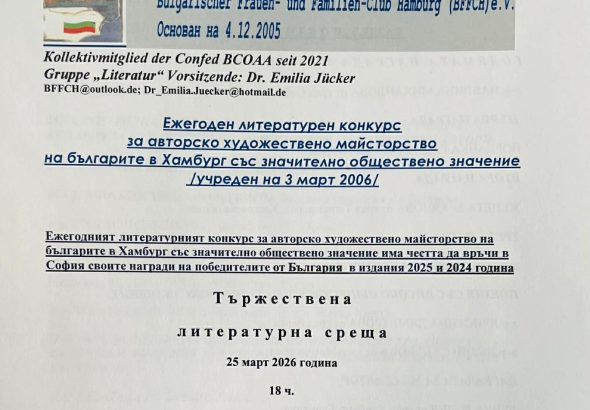 Културно дружество "Клуб на българските жени и семейства в Хамбург" ще връчи наградите на победителите в ежегодния...