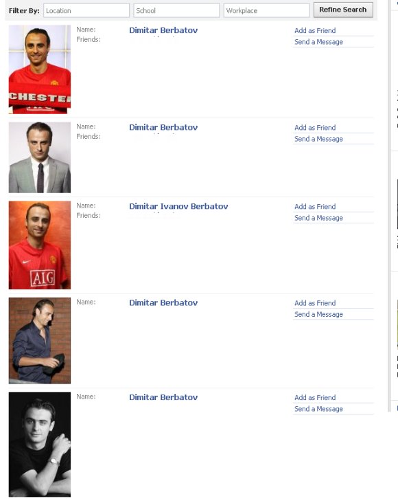 Редакцията ни направи проверка и установи, че под името на футболиста Димитър Бербатов във Фейсбук има открити над 200 профила, като в някой от тях броят на приятелите му е от 2 до над 4 хиляди. Интересното е, че част от неговите фенове са в контакт с по няколко профила на Бербататов, но явно това не ги смущава.