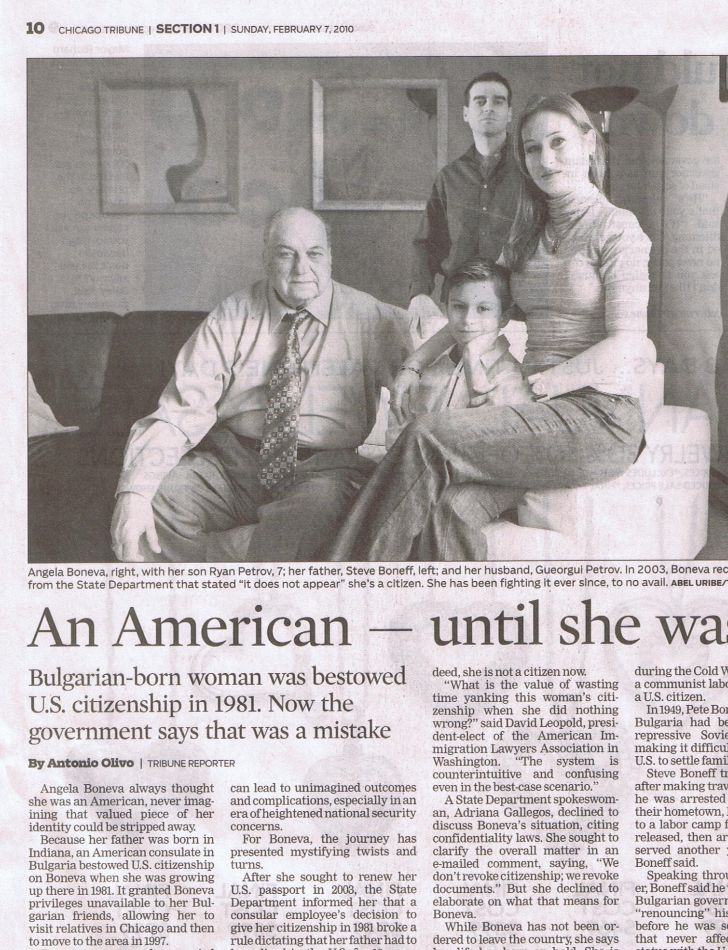 ”Чувствам се в безизходно положение” – казва г-жа А. Бонева живееща в Найлс край Чикаго, която се опитва да си върне американското гражданство вече 7 (седем) години. Днес във в-к «Чикаго трибюн» излезе пълният вариант, на материала от електронното издание, за което вече бе съобщено (линк).