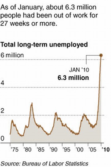 Броят на дългосрочно безработните (останали без работа преди повече от половин година) е без особено изменение и е на нивото от декември 2009-та 6,1 милиона. Както Eurochicago.com вече съобщи в статията си Новите сиромаси в САЩ, това са най-големите нива от 1948 г. (от самото начало на тази статистика). Вижте графиката: