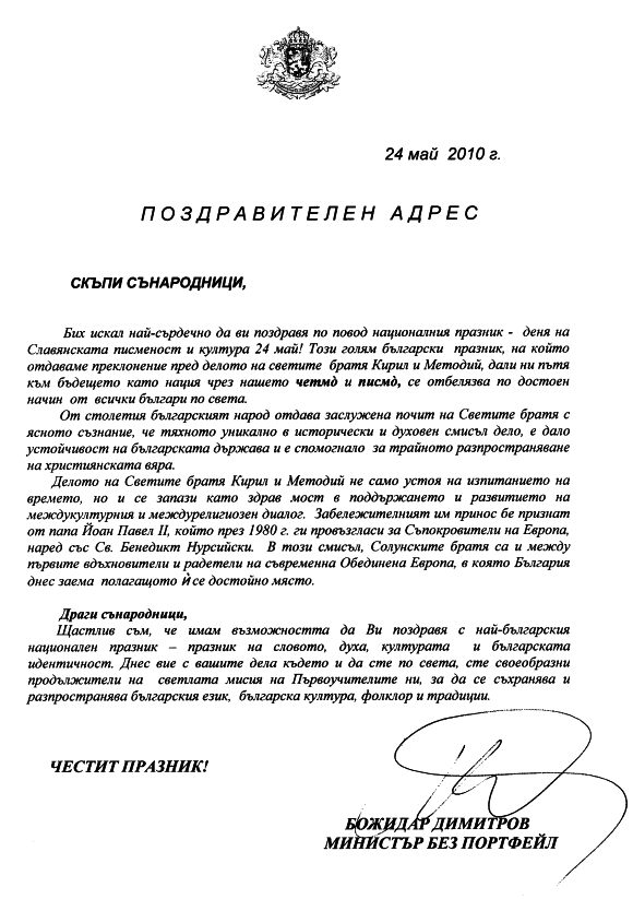 Щастлив съм, че имам възможността да Ви поздравя с най-българския национален празник – празник на словото, духа, културата и българската индентичност. Днес вие с вашите дела където и да сте по по света, сте своеобразни продължители на светлата мисия на Първоучителите ни, за да се съхранява и разпространява българския език, българската култура, фолклор и традиции.