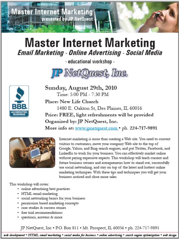 Internet marketing is more than creating a Web site. You need to convert visitors to customers, move your company Web site to the top of Google, Yahoo, and Bing search engines, and put Twitter, Facebook, and LinkedIn to work for your business. You can effectively market online without paying expensive experts. This workshop will teach current and future business owners and entrepreneurs how to stand out, successfully use social networking, and stay on top of the latest and hottest online marketing techniques. With these tips and techniques you will get your business noticed and close more sales.