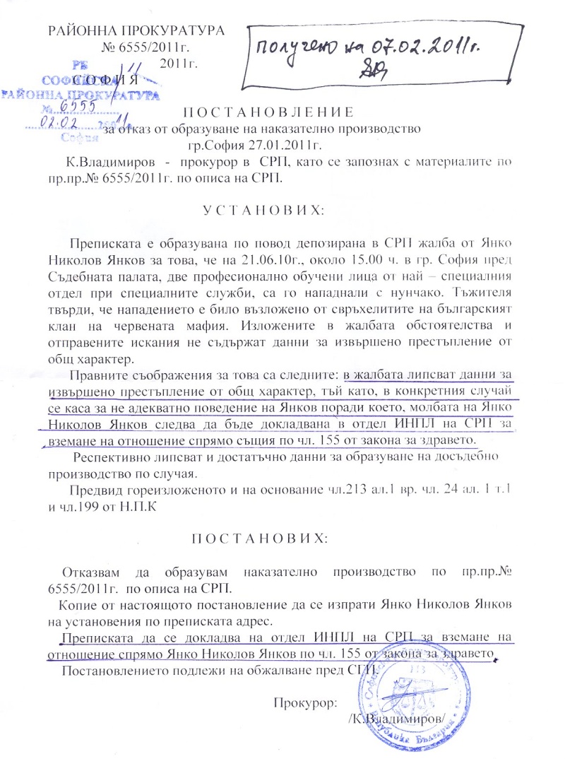 След всичкото това, СЛЕД ПОЧТИ ОСЕМ МЕСЕЦИ, преди два дни, на 07.02.2011г., понеделник, с препоръчана поща получих копие от издадено на 27.01.2011 г., регистрирано на 02.02.2011 г. Постановление за отказ от образуване на наказателно производство.