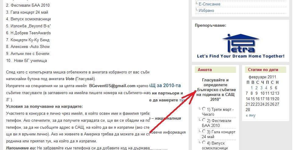 За да бъдете включени в жребия за наградата лаптоп Lenovo 15.6” HD LED, е необходимо да гласувате еднократно за някое от 10-те номинирани събития в специалната ни АНКЕТА, която се вижда на всяка страница на нашия уебсайт (търсете я малко надолу и по-вдясно от центъра – къде точно се намира, се вижда на Рисунка-1 от илюстраците ни в края).