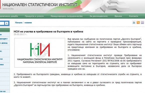Във връзка със съобщение на политическа партия „Другата България”, публикувано на сайта на партията и проведена пресконференция, където Националния статистически институт беше обявен като партньор на предстояща кампания за преброяване на българите в чужбина, уточняваме: