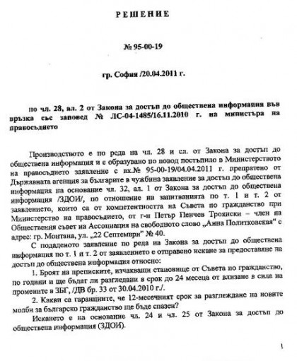 На 20.03.2011 г. до Държавна агенция за българите в чужбина (ДАБЧ) и на вниманието на нейния председател Росен Иванов бе изпратено писмо със заявление за ДОСТЪП ДО ОБЩЕСТВЕНА ИНФОРМАЦИЯ (линк) от Петър Пенчев Троянски, член на Обществения съвет на Асоциация на свободното слово “Анна Политковская”, и от редактора на Eurochicago.com Петър Стаматов.
