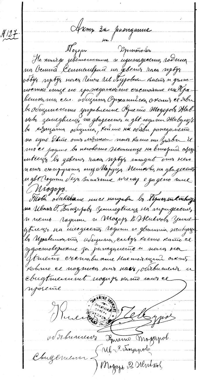 Това обявяване ни се направи в присъствието на Иван Г. Банзаров, земледелец, на тридесет и пет години и Тодор В. Живков, замледелец, на шестдесет години, и двамата живущи в Правешката община, след което като се удостоверихме за раждането и пола на детето, съставихме настоящий акт, който се подписа от нас, обявителя и свидетелите, подир като им се прочете.