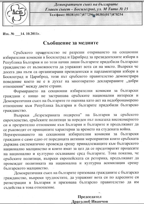 Председателят на демократичния съюз на българите (ДСБ) Драголюб Иванчов от Босилеград се обърна със следното съобщение за медиите, което може да изтеглите като PDF файл от тук –Б-избори.