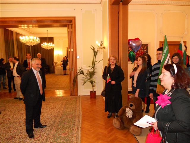 С учениците от 8 клас и атрибутите на училището ни (сред които и нашият талисман Мечо Българан) влязохме в салоните, за да поздравим посланика и да му благодарим за всичко, което направи за нас. Изпратихме го с думите на песента за приятелството: