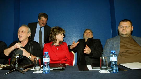 На пресконференцията за учредяването на новия издателски съюз. Отляво надясно: Тошо Тошев (”Преса”), Тодор Батков (”Стандарт”), Светлана Шаренкова (”Земя”), Петьо Блъсков (”Република”) и Делян Пеевски (”Телеграф”, “Монитор” и др.). Снимка: Булфото