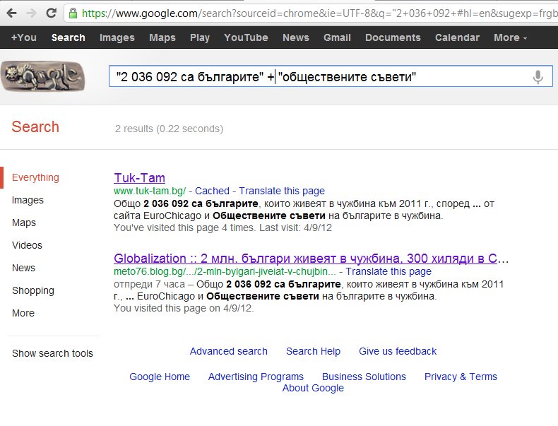 Една такава млада неправителствена организация, каквато е Обществените съвети на българите по света, която вече е хвърлила много усилия на доброволни начала (особенно около последните парламентарни, а след това и президентски избори), би желала инициативите и да достигат по-често до медиите. Информацията за българите в чужбина по държави бе издирена и изискана именно от тях (и за да бъдем по-конкретни – специално от д-р Стефан Манов от Франция). За съжаление ето какво подсказва Гугъл ако там потърсим точната цифра на българите в чужбина съобщена ни от Обществените съвети – 2 036 092.
